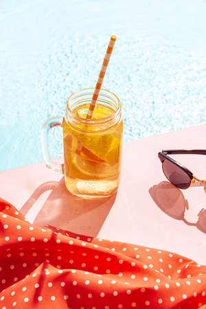 Glass of fresh lemonade with drinking straw and garish green sunglasses on the table. Swimming pool blurred background.