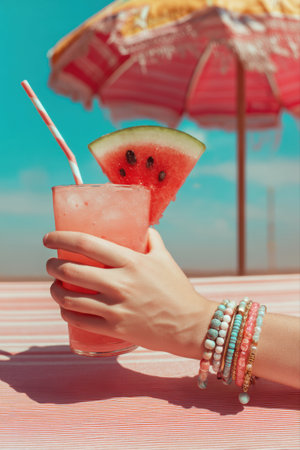A woman's hand holding a glass of cold watermelon smoothie juice with bright red. The backdrop is a soft indigo sea, clear sky, and islands. Feeling refreshing and sweet. Summer and vacation concept.