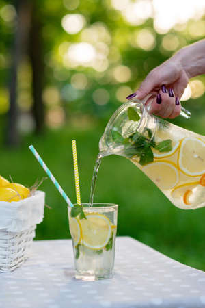 Female hands pour refreshing cold lemonade with lemons in ice and mint from a jug into a glass on a summer garden table on a picnic. Soft selective focus.