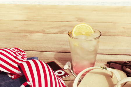 Cold drink with ice and a slice of lemon on the beach on a hot summer day