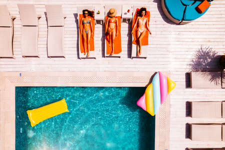 Friends in swimsuit who tan in the sunbed in a swimming pool