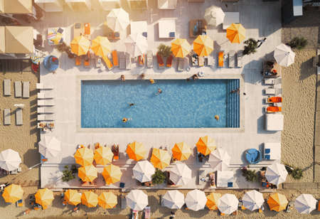 Top view of people relaxing in the pool on yellow inflatable circles and sun beds on the beach.