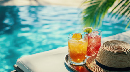 A straw hat and sunglasses rest by a shimmering poolside. A scene that speaks of summer relaxation and vacation vibes.