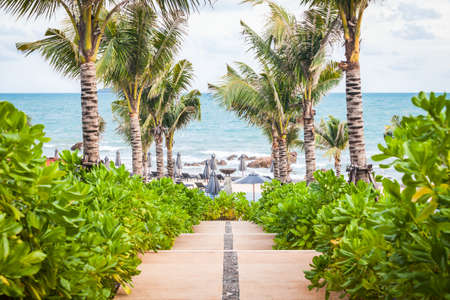 Walkway to the beach in a beautiful Park with Palms, Rayong Beach, Thailand.