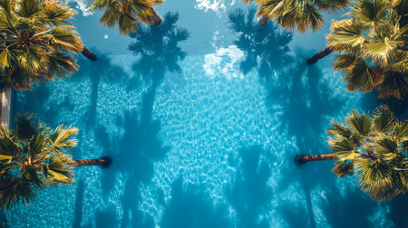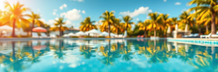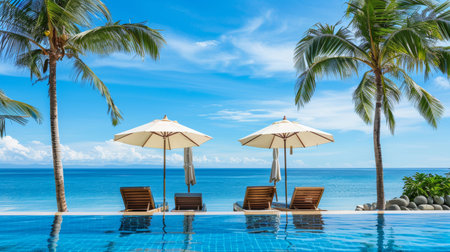 Luxury beach resort hotel swimming pool with leisure beach chairs, palm trees and blue sky