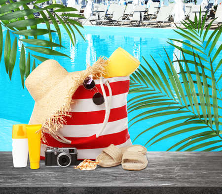 Stylish bag with beach accessories and camera on gray stone surface near outdoor swimming pool