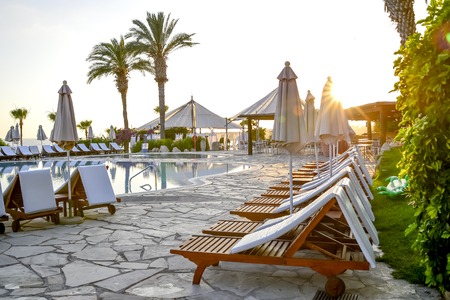 Luxury beach resort, gorgeous white sunbeds situated near the pool with transparent blue water, perfect place for summer vacation, Cyprus island