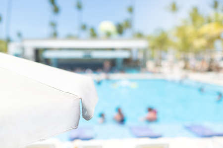 Close up of white fabric beach umbrella with blurred swimming pool in resort, summer vacation concept card.