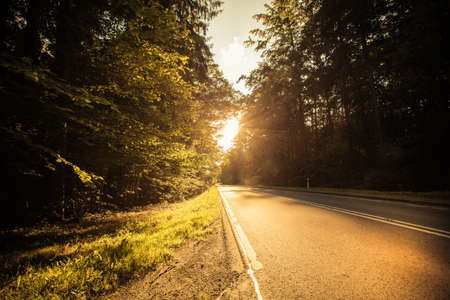 Country road with markings in the middle of the forest. Path and forward movement in the sun. Beautiful, green forest in the spring at sunset. Concept for success in the future goal and passing time