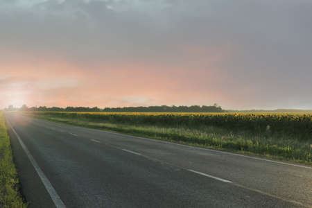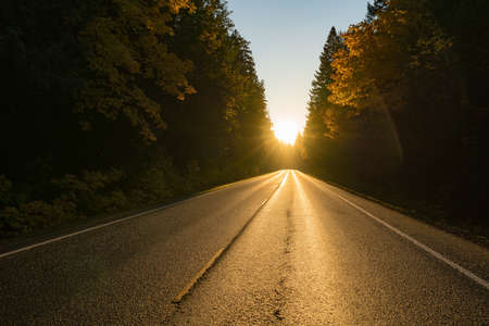 Straight road and colorful sunset. Scenic road landscape.