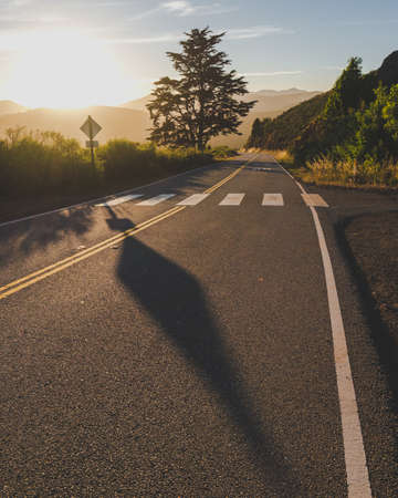 A shot from ground level of the dividing lines between lanes on Ortega Highway in Southern California
