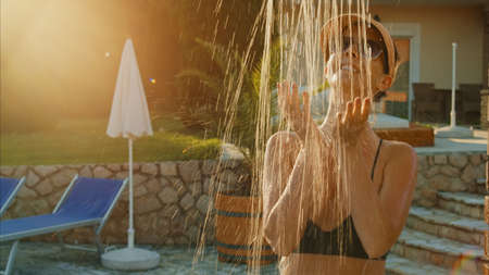 Girl washes under summer shower outdoor at sunset. Relaxing spa procedure under water