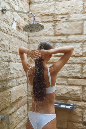 Back view of young adult girl washing head, making morning routine procedure, taking shower, standing in bathroom and enjoying flowing water