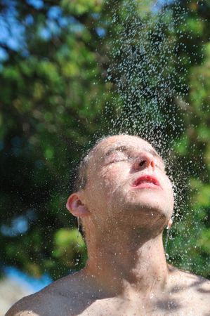 young man relaxing under shower