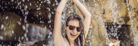 Young joyful woman under the water stream, pool, day spa, hot springs BANNER, LONG FORMAT