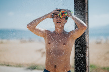 Young man enjoying a refreshing beach side shower in the summer sun