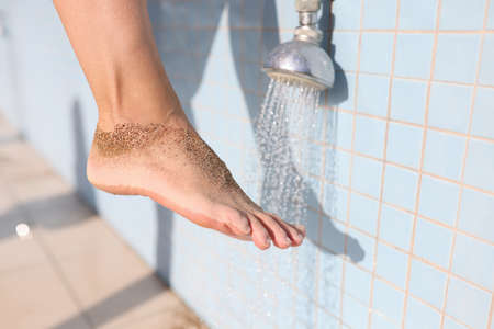 Woman washing her foot from sand under shower on beach closeup