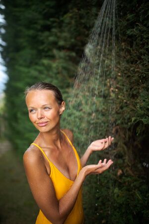 Beautiful young woman taking a shower outdoors. Attractive young woman in yellow one-piece enjoys shower on hot sunny day after a swim. Heat and refreshment concept.