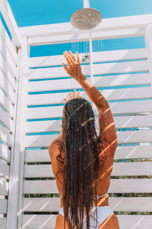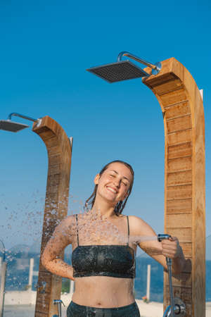 Beautiful young woman takes a relaxing shower in a swimsuit on a sunny day outdoors by the sea. Lifestyle