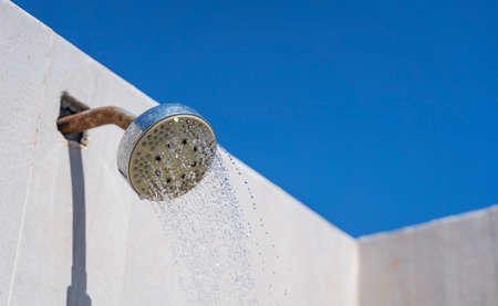 Shower with running water against the blue sky on the beach.