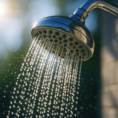 Closeup of outdoor shower head spraying water with sunlight reflections