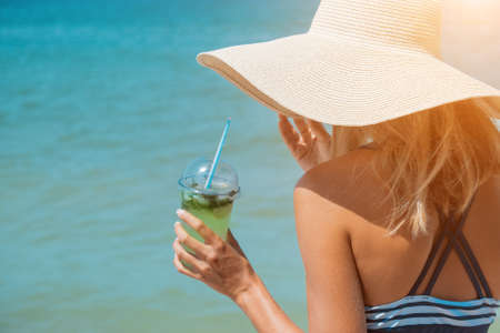 Woman on the beach holding a cocktail in her hands. Selective focus. Drink.