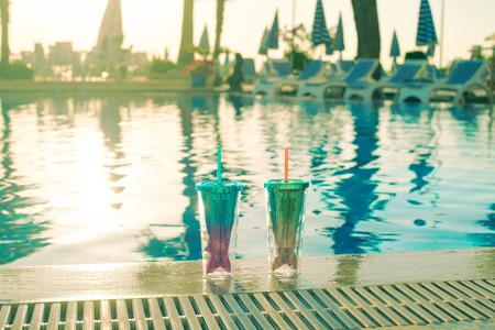 beach holidays background with two cocktails In mermaid tail glass near swimming pool in luxurious hotel