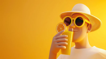 A close-up of a man wearing sunglasses, enjoying a citrus beverage with a straw on a sunny beach.