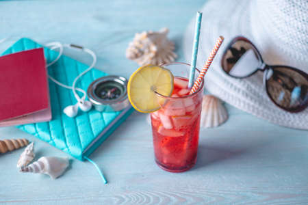 Glass of red lemonade drink with lemon and fruit and straw on the table. Accessories for summer Sunny holidays in the resort