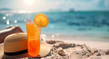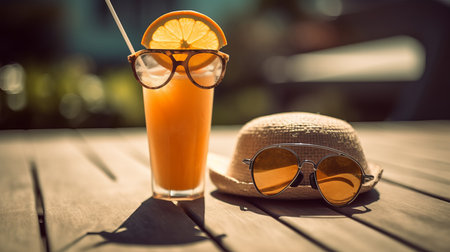 Orange fresh juice, hat and sunglasses near sea