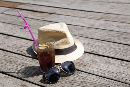 Summer accessories, sunglasses, hat and drink. Travel wooden background with copy space. Top view.