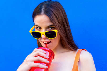close up pov portrait of Young beautiful woman with sunglasses standing on blue background wall drinking from reusable bottle canteen. sexy girl wearing summer clothes looking intense at camera