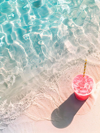 A vibrant scene featuring stylish sunglasses and a refreshing drink resting on the shimmering water surface of a tropical beach. Perfect for summer vibes!