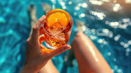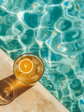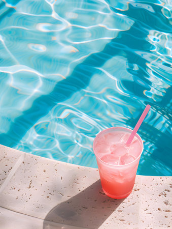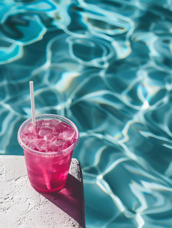 This vibrant image features a refreshing summer cocktail filled with ice and colorful fruits, captured near a sparkling swimming pool. Perfect for summer vibes!