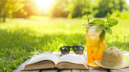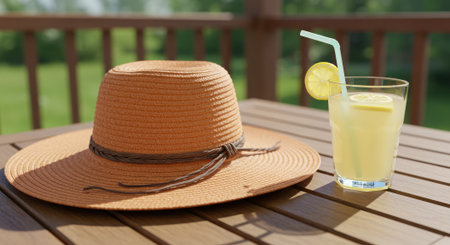 A peaceful composition featuring a straw sun hat and a refreshing glass of lemonade resting on a wooden table on a sunny summer afternoon. This serene shot symbolizes the simple pleasures of the season, a quiet personal break, and the joy of a 'staycation.' An ideal visual for themes of lifestyle, relaxation, summer drinks, and finding peace.