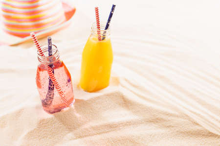 mojito on summer sandy beach. Mojito in glass jars on the sea coast. summer beach fun in the sea