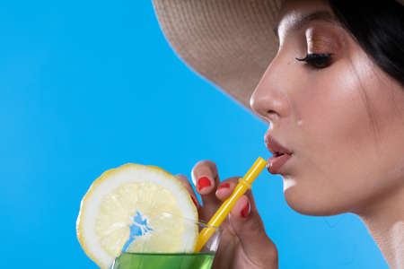 Young woman with long dark hair drinking a summer refreshing cocktail through a straw. Selective focus