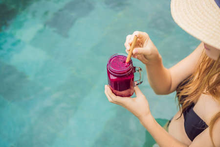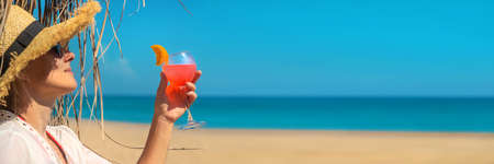 Diet. Healthy eating and rest. woman drinks cocktail in glass background sea. A woman on the beach enjoys life