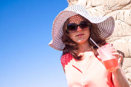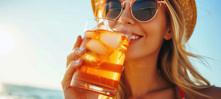 Young girl drinks cold cocktail on the beach