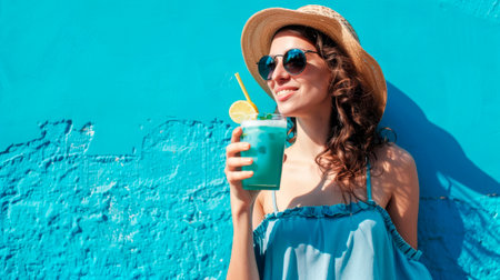 A happy woman with a straw hat and sunglasses is sipping on a blue drink with a straw, her hair styled perfectly under the hat, enhancing her vision care with trendy eyewear