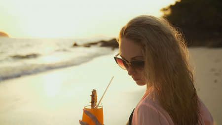 Woman having iced drink on the beach at sunset