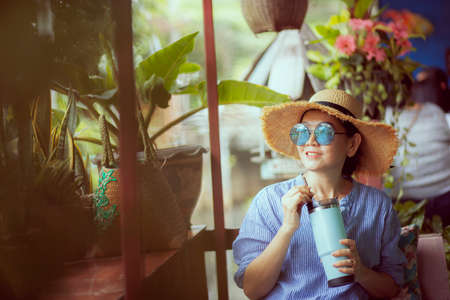 woman relaxing with cool drink bottlin in hand