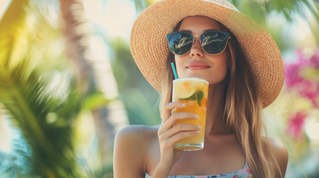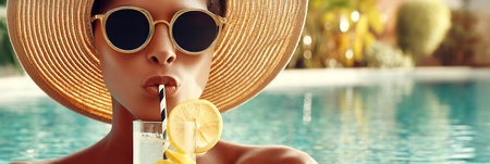 African American woman is enjoying a refreshing cocktail by the poolside, wearing stylish sunglasses and a wide-brimmed hat, embodying relaxation and the essence of summer vibes