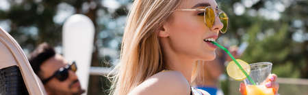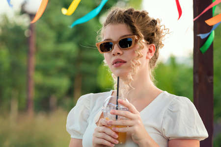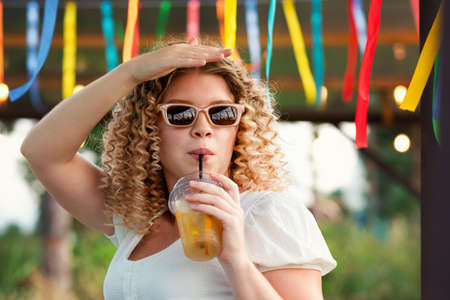 Attractive blonde curly girl in sunglasses and summer outfit enjoying lemonade, non-alcoholic cocktail at party in city park on open veranda. Cute young woman drinking. summer vacation