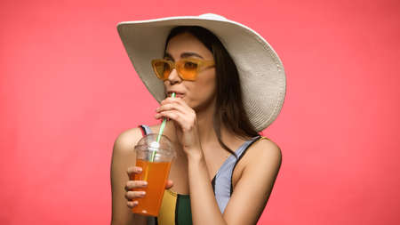 Woman in sun hat and swimsuit drinking cocktail isolated on pink