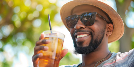 Summer Refreshment. Close-up of young man enjoys fresh juice on sunny day in. Focus on a glass.