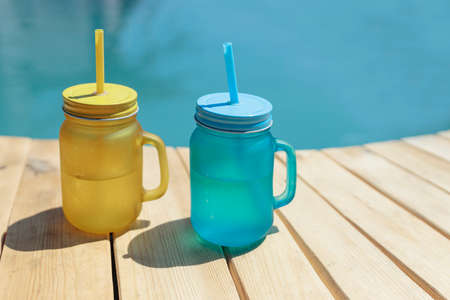 two cocktails of yellow and blue standing by the pool. Pool party outdoors