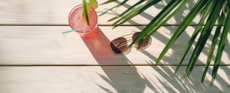 Refreshing Pink Drink and Sunglasses on Wooden Table Surrounded by Tropical Palm Leaves in Summer Sunlight Copy space.