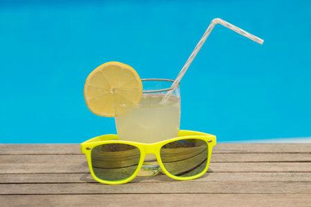 Glass of fresh lemonade with drinking straw and garish green sunglasses on the table. Swimming pool blurred background.