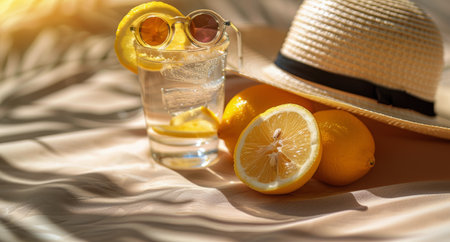 A summer table setting featuring lemon slices in glasses, a straw hat, and sunlight streaming through the scene.